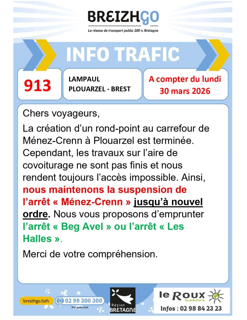 Ligne 913 : Lampaul Plouarzel – Brest à compter du 30 lundi mars 2026