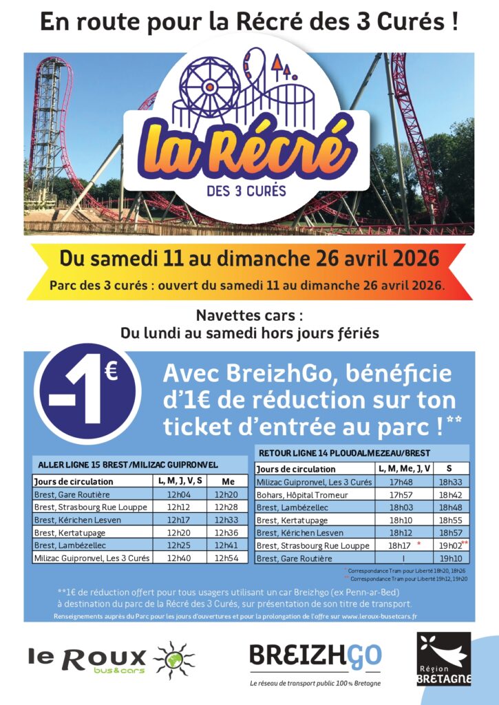 Pour vous faciliter l’accès au parc. Nous mettons à votre disposition des liaisons de cars les mercredis et samedis au départ de Brest. Il vous suffit de présenter votre titre de transport validé sur la ligne 14 ou 15 pour bénéficier de la remise.